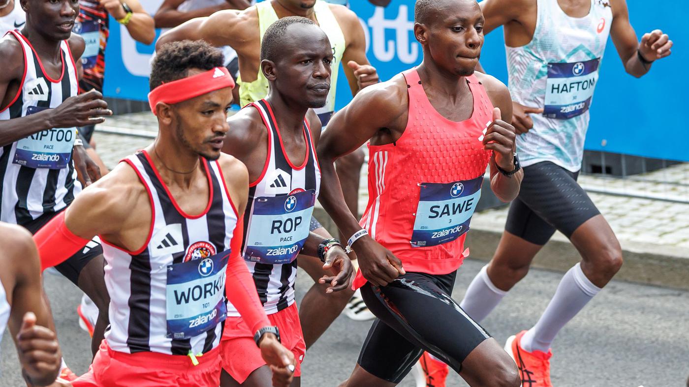Schon unmittelbar nach dem Startsignal, das Berlins Regierender Bürgermeister Kai Wegner (CDU) gab, setzten sich Sawe, Vorjahressieger Milkesa Mengesha aus Äthiopien und Gabriel Geay aus Tansania vom Rest des Feldes ab. Mit 18 Grad war es bereits beim Start um 9.15 Uhr schon recht warm, dazu kam eine Luftfeuchtigkeit von rund 80 Prozent. Dennoch waren die Tempomacher im Weltkordtempo unterwegs.