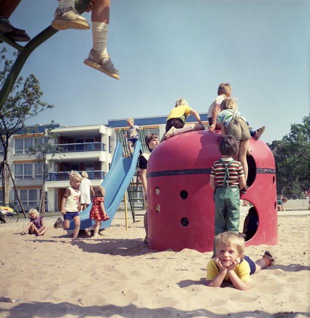 Eine tonnenförmige Form, oben geschlossen und mit einem Loch zum Hineinklettern. Sie diente Millionen von DDR-Kindern zum Spielen. Die Form und das harte Material erinnern durchaus an einen dieser Ein-Mann-Bunker, von denen man auch Aufnahmen in Mühes Ausstellung sehen kann.