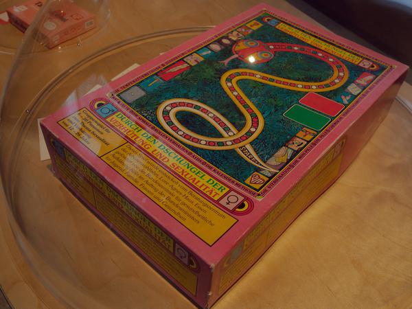 Apropos Aufklärung. Damit befasst sich der nächste, in sachliches Dunkelgrün getauchte Bereich, dessen Szenografie ein Klassenzimmer simuliert. Skizziert wird die Kulturgeschichte der Aufklärung in der Bundesrepublik und der DDR. Vorbei an Sigmund Freuds Modell der sexuellen Phasen, Aufklärungsbüchern und alten Ausgaben der „Bravo“ geht es zu den Vitrinen mit Unterrichtsmaterialien Ost und West. Genau, dieser anatomische Querschnitt durch die weiblichen und männlichen Genitalien kommt einem aus dem Bio-Unterricht bekannt vor. Audios, Videos und Texte, die man per Klick aktiviert, liefern eine Chronologie des Vermittlungsstands zur sexuellen Bildung in beiden Deutschlands.