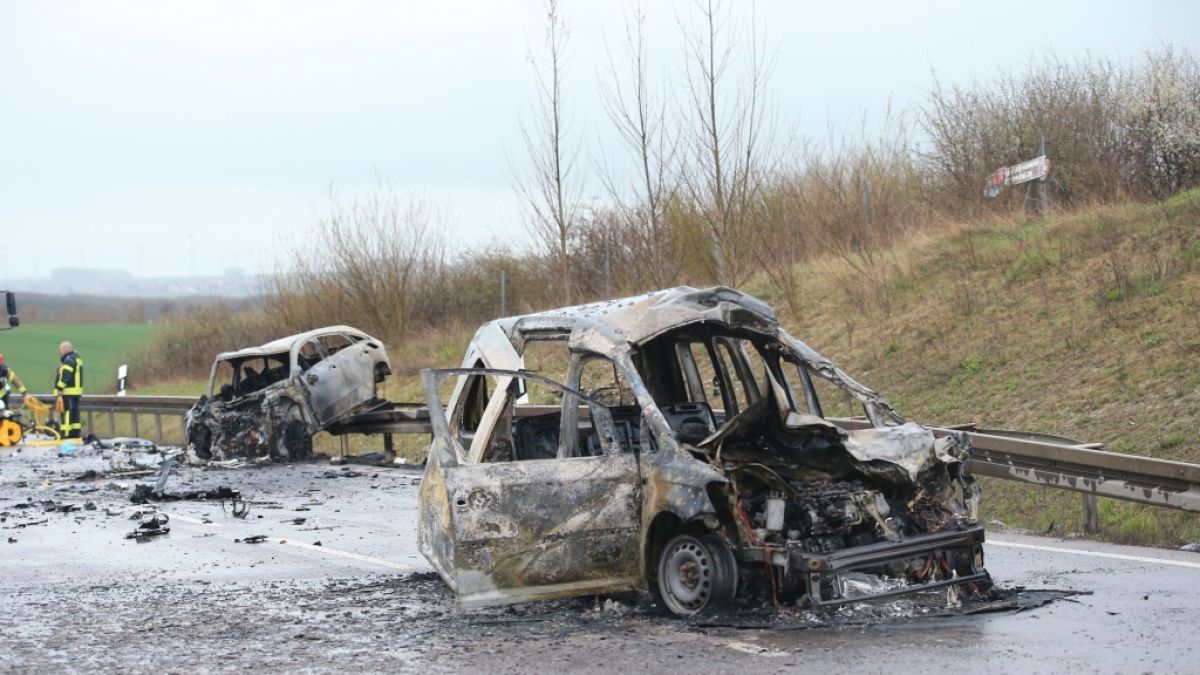 Am späten Samstagnachmittag waren die drei Unfallautos im Westen des Freistaats mit großer Wucht ineinander gekracht. Der Unfall ereignete sich in einer langgezogenen Kurve der B247, die Straße hat dort eine Fahrspur pro Richtung. Nach ersten Erkenntnissen war eines der Autos aus zunächst ungeklärter Ursache in den Gegenverkehr geraten und in die beiden entgegenkommenden Fahrzeuge gekracht. Zwei der Wagen brannten komplett aus. Wie heftig der Zusammenprall gewesen sein muss, ließ sich an den Trümmern ablesen: Zwei der Fahrzeuge wurden bis zur Unkenntlichkeit zerstört – eines der verkohlten Wracks lag quer auf der Leitplanke, das andere blieb mit zerfetzter Karosserie auf der Straße stehen. Das dritte Auto lag umgekippt am Straßenrand.