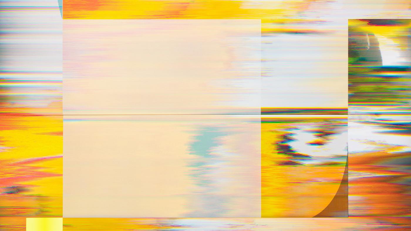 Zartes Orange wächst neben horizontalem Pink empor, links und rechts wird es von wolkigem Rosa gerahmt, das sich aufzulösen scheint. Flirrende grüne Streifen simulieren Bewegung – man denkt an die Spuren, die ein Druckkopf hinterlässt, wenn er sich hin und her bewegt. Darüber schlägt helles Blau noch weiter zu den Seiten aus, um im oberen Drittel feurig lodernd, in zackigem Violett und kräftigem Blau zu enden.