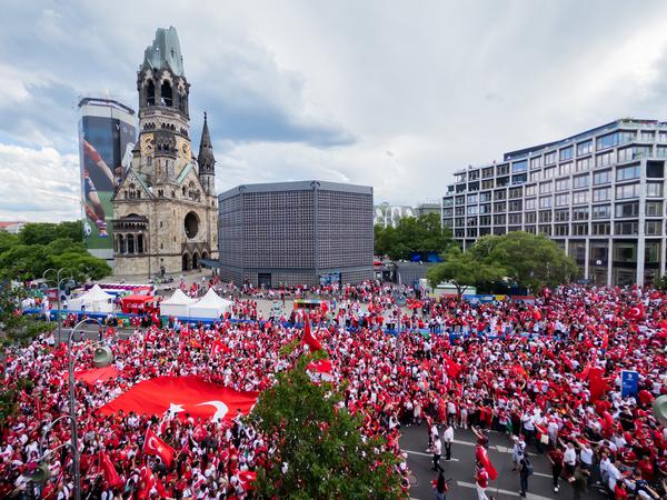 Am Nachmittag hatten sich zunächst tausende Anhänger des türkischen Nationalteams rund um den Breitscheidplatz versammelt und ein Fanfest gefeiert. Rund 5000 Fans waren nach Polizeiangaben gegen 16 Uhr vor Ort, bei anhaltendem Zustrom. Der Verkehr rund um den Platz kam zum Erliegen, Tauentzien- und Budapester Straße wurden gesperrt. Auch die umliegenden Restaurants waren voller türkischer Fußballfans, freie Tische Mangelware. Großer Jubel brandete auf, als ein niederländischer Fan auf eine Laterne kletterte und mit der türkischen Flagge wedelte.