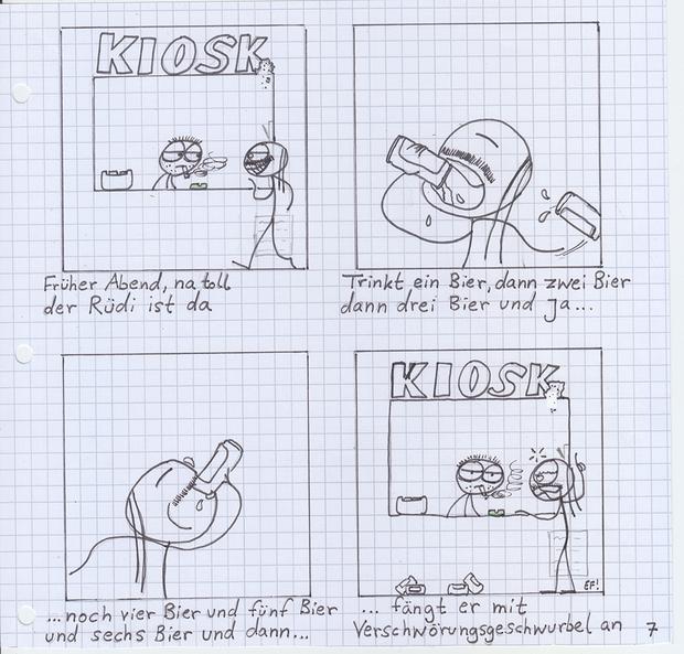 Übrigens total spannend: Ich reise hin und wieder in die USA und habe auch eine Zeit in Kanada gelebt und meine Zeichnungen auch in Do-it-yourself Manier als englische Heftchen raus- und dort in die Comicläden gebracht. Es kam kein einziges Mal vor, dass der Zeichenstil hinterfragt oder gar kritisiert wurde, einfach weil das dort nichts Besonderes mehr ist, dass Leute Kunst veröffentlichen, die offensichtlich „nichts können“, da ist sofort klar: Ahja okay, das hier funktioniert also über den Text und die reduzierte Darstellung von Mimik und Gestik.