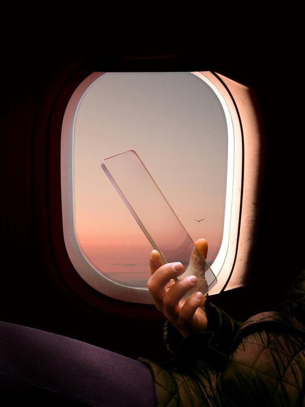 Ein Smartphone schiebt sich diagonal in die ovale Scheibe der Flugzeugluke. Irritierend ist nur der komplett transparente Bildschirm, der das Fensterglas überlagert. Dahinter taucht ein irisierender Himmel vom zartrosa Morgen bis zum grünen Sternenleuchten der Nacht auf.