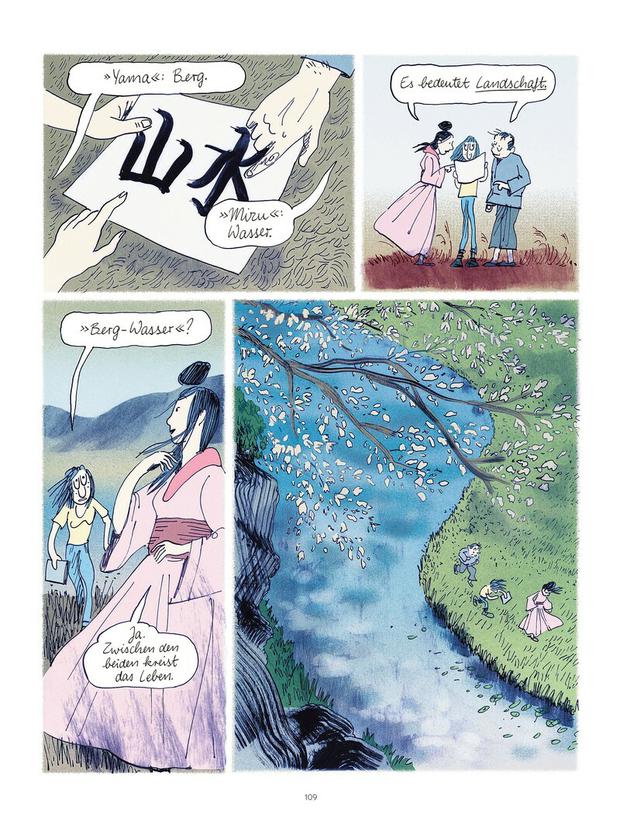 Meurisse schickt ihr Alter Ego in das fernöstliche Land, das schon im 19. Jahrhundert die europäische Kunstszene faszinierte, um ihr „viel zu westliches inneres Bildarchiv“ aufzufrischen. Ihre Pinsel hat sie vergessen, im Gepäck ein paar Worte Japanisch, ansonsten folgt sie ihrer Intuition – und staunt: rauchende Vulkane in blauer Ferne, ordentlich aufgereihte Reisgarben, rote Kamelien und lila Glyzinien, und dann wieder krasse Betonwälle zum Schutz vor Fluten.