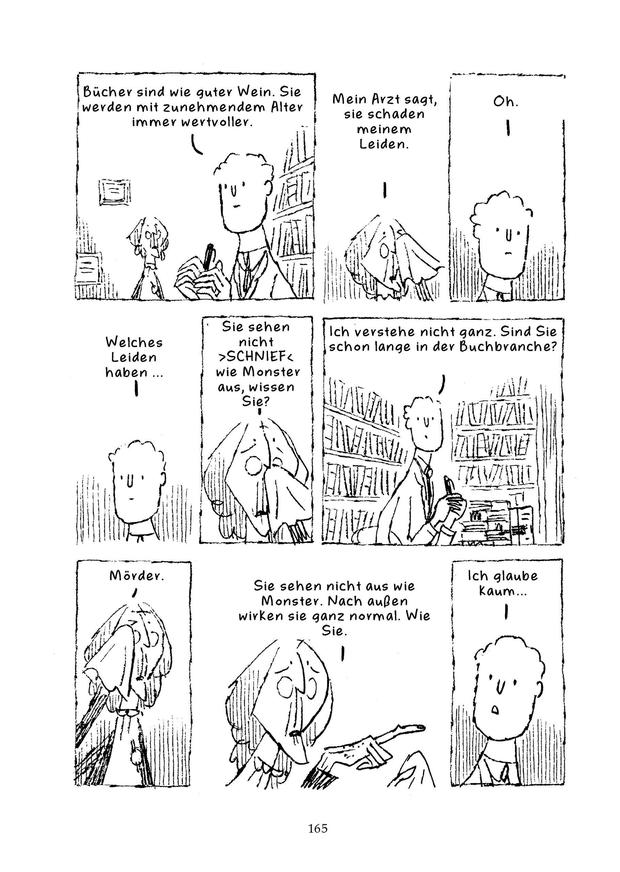 In seinen schwarzweißen Zeichnungen – sparsam bei Figuren und den pointierten Dialogen, voller Details bei Architektur, den vollgestopften Regalen der Buchläden oder den im Lauf der Tour immer schäbigeren Hotelzimmern – treibt Watson die Geschichte gemächlich ins immer Groteskere. Wunderbar.