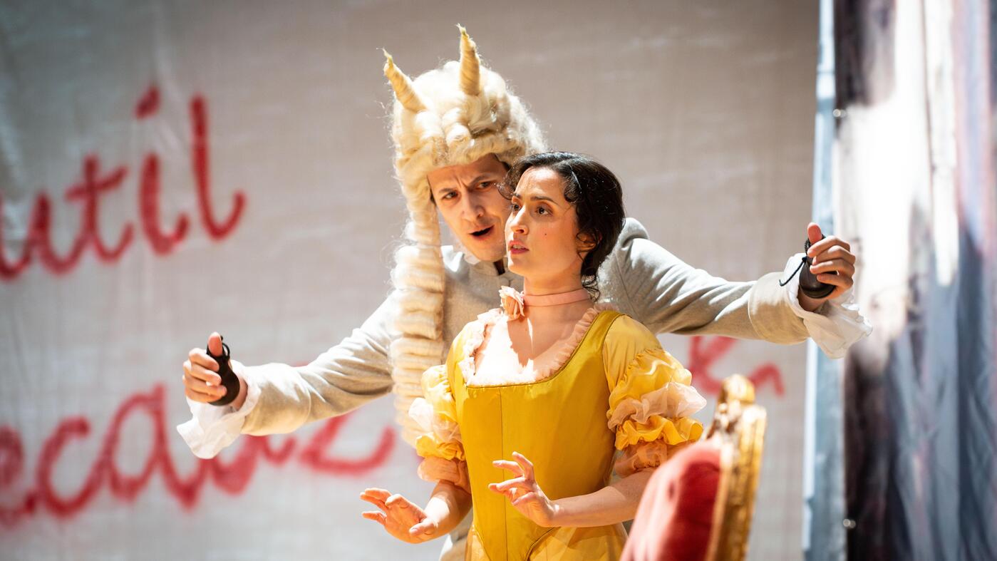 Logisch, dass in einer Oper, die „Der Barbier von Sevilla“ heißt, die Bedeutung von Frisuren gar nicht überschätzt werden kann. So trägt der ungarische Sänger Gergely Kereszturi als Dr. Bartolo, der sein Mündel Rosina quasi gefangen hält und heiraten will, eine lächerlich lange Puderperücke mit zwei Hörnern, was ihn als betrogenen „Ehemann“ ausweist. Denn natürlich liebt Rosina eigentlich einen anderen: Graf Almaviva.