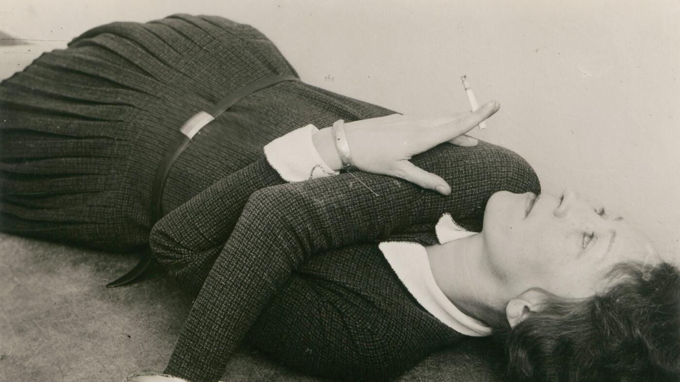 Die Aufnahme muss damals unerhört gewirkt haben. Eine junge Frau mit kurzem Rock und Bubikopf liegt flach auf dem Boden, offenbar am Rand einer Terrasse, denn der Hintergrund bleibt vage. Die Arme hält sie vor der Brust gekreuzt, zwischen den Fingern ihrer linken Hand glimmt eine Zigarette.
