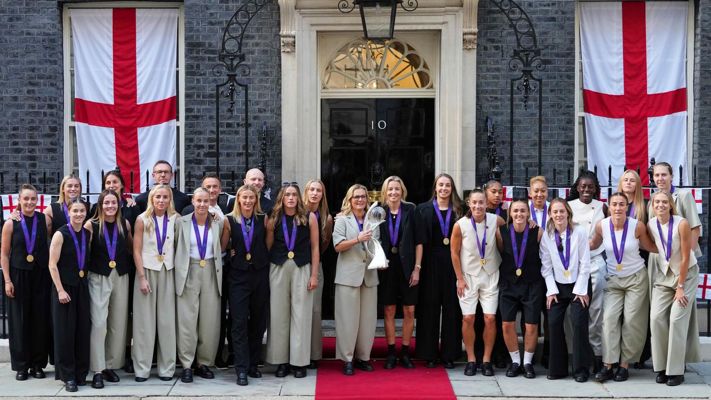 Nach einem stimmungsvollen Empfang am Flughafen durch die Fans sind Englands Fußballerinnen für ihren EM-Triumph von der Regierung an der Downing Street geehrt worden. Der Rote Teppich vor der offiziellen Residenz des britischen Premierministers in London war ausgerollt, die Fenster mit England-Fahnen behängt.
