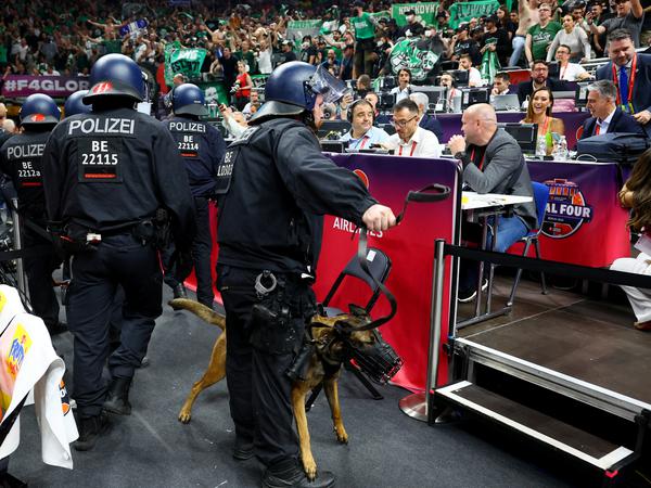 Auf dem Platz vor der Halle kam es dann etwa eine Stunde vor dem geplanten Beginn um 18 Uhr zu einem ersten größeren Zwischenfall. „Zwischen rivalisierenden Fangruppen kam es dabei zu Auseinandersetzungen, bei denen auch Pyrotechnik eingesetzt und Flaschen geworfen wurden“, schrieb die Berliner Polizei auf X. Laut dem Portal „Basketnews“ waren vor allem Fans von Fenerbahçe und Panathinaikos involviert. Demnach habe es mindestens zwei Verletzte gegeben.
