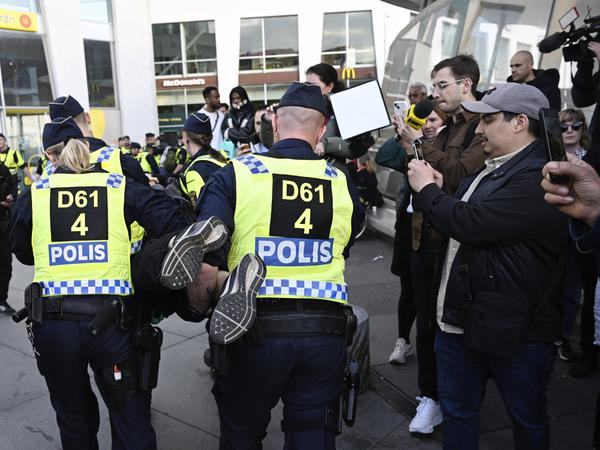 Polizisten tragen vor dem ESC-Finale in Malmö pro-palästinensische Demonstranten weg.