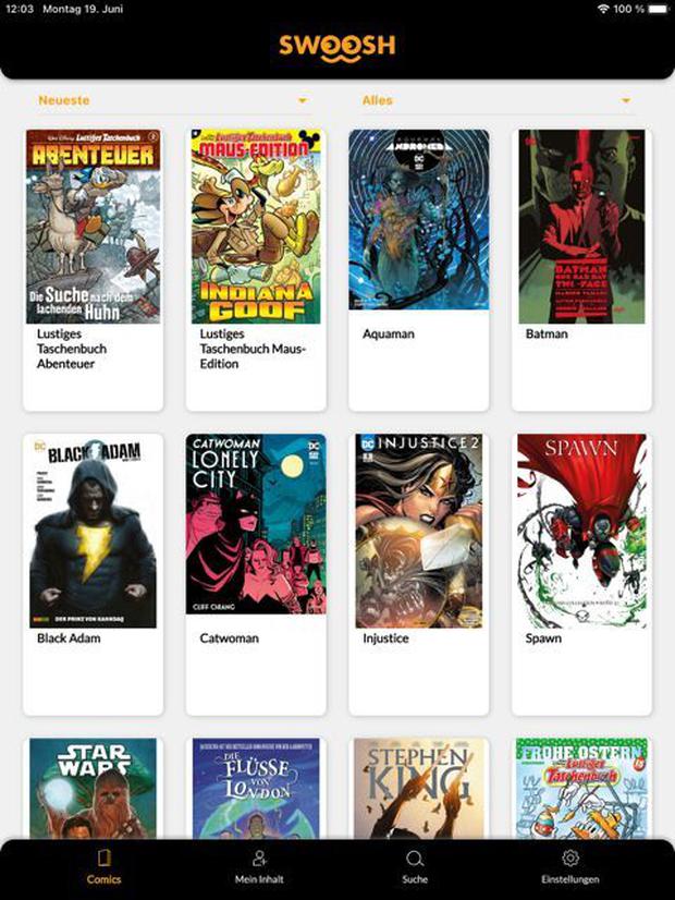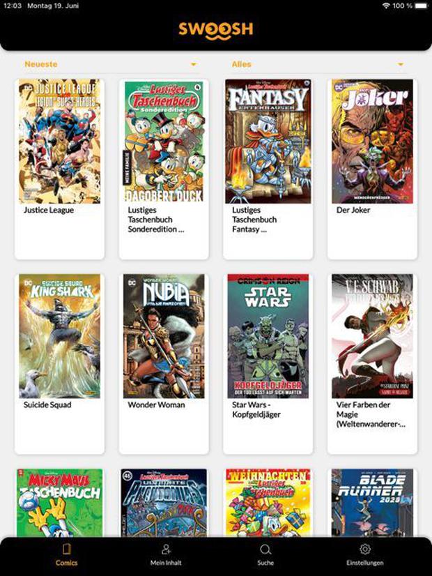 Angelehnt an das Erfolgsmodell des Film-Streamingdienstes Netflix können Comic-Fans auf www.swoosh.de für einen monatlichen Abopreis von 9,99 Euro auf Dutzende laufende Heft- und Albenserien zugreifen. Dazu gehören vor allem klassischen Erfolgstitel wie das „Micky Maus-Magazin“, „Lucky Luke“ und „Lustiges Taschenbuch“ (Egmont Ehapa) sowie mehr als 900 Comics aus Serien wie „Batman“, „Superman“ und „Star Wars Comics“ (Panini).