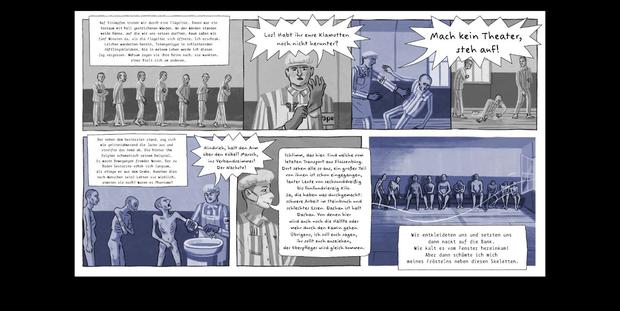 Die Graphic Novel, an deren Erarbeitung ein fast 20-köpfiges Team beteiligt war, berichtet von Demütigungen, Misshandlungen und grausamen Strafen, mit denen Menschen psychisch gebrochen wurden. Kupfer-Koberwitz sieht „Totengerippe in schlotternden Häftlingskleidern“. Und er beobachtet Jüdinnen und Juden, die vom Hunger getrieben in den Abfällen suchten, die sie in einer Grube mit Füßen einstampfen sollen.