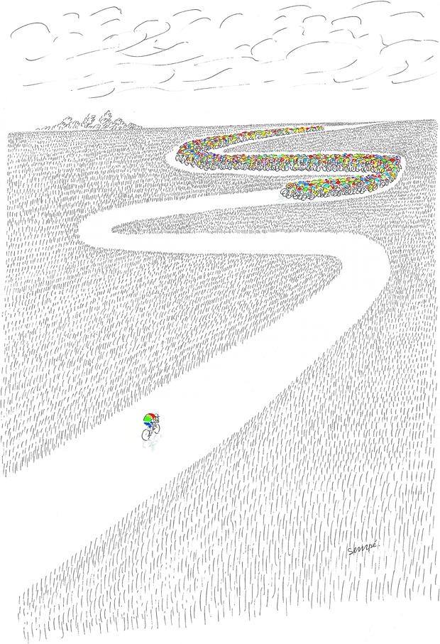 Die Aquarellmalerei hat Sempé erst spät für sich entdeckt und eine eigene, verwischende Technik entwickelt, die die feinen Tuschelinien perfekt ergänzt oder überdeckt und so impressionistische Stimmungen hervorzaubert.