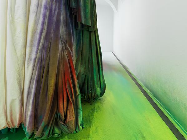 Die Pfeilerhalle suggeriert zugleich eine Ateliersituation. Die auf den Leinwänden entstandenen Bilder können nach Ausstellungsende weiterwandern, in den Markt eingehen, während die Installation wie so oft bei Katharina Grosse abgebaut wird. Der Großteil ihrer Kunst ist ephemer.