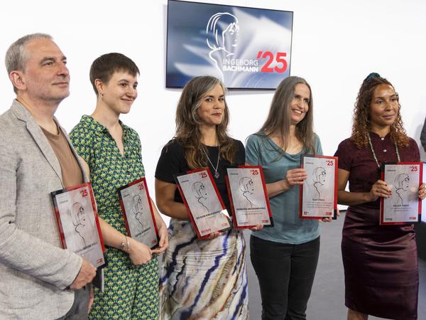 Die Preisträger des diesjährigen Ingeborg Bachmann-Preises, von links: Boris Schumatsky, Tara Meister, Natascha Gangl, Almut Tina Schmidt und Nora Osagiobare. Tara Meister bekam ein zweimonatige Stipendium am Ossiacher See, das mit 3.000 Euro dotiert ist.