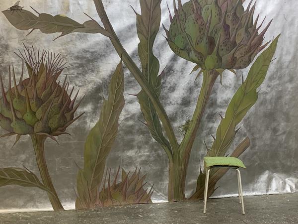 Manchmal, wenn Inka Gierden zum Pinsel greift, landet auch mal etwas scheinbar Profanes auf einem vergoldeten oder versilberten Stoff – und wirkt prompt ganz außergewöhnlich und kostbar. Zum Beispiel ein Radieschen, Rote Bete – oder Artischocke. An dem Korbblütler fand Inka Gierden nicht nur die Farbigkeit ansprechend, das leuchtende Lila und die satten Grüntöne. „Mit den vielen Schichten und Stacheln ist die Pflanze auch als Skulptur einfach wunderschön“, sagt sie.