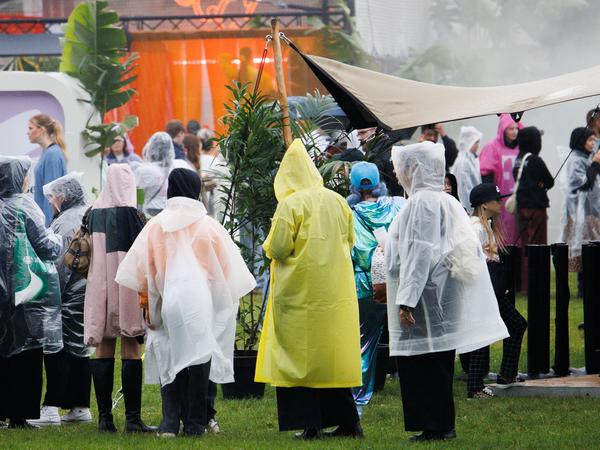Bis dahin gilt es, in jeder Hinsicht trocken zu bleiben. Hätte der angekündigte Jahrhundertsommer schon gestartet, könnte man meinen, man wäre auf dem kalifornischen Coachella, oder auf dem katalanischen Primavera – so aufwändig herausgeputzt haben sich viele der Gäste. Glitzer im Gesicht, Cowboy-Stiefel an den Füßen, Federn im Haar. Jetzt ist es aber nun mal nass und grau, die schöne Kostümierung mit schützendem Plastik verhüllt.