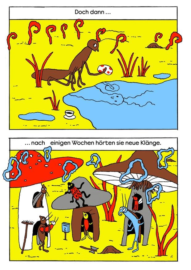 Das ist ihr gelungen. „Die Grille in der Geige“ verbindet Bilderbuch- und Comicelemente und spielt in einer liebevoll gezeichneten Fabelwelt, die bewohnt wird von drolligen Insekten und anderen Kleintieren mit menschlichen Eigenschaften.