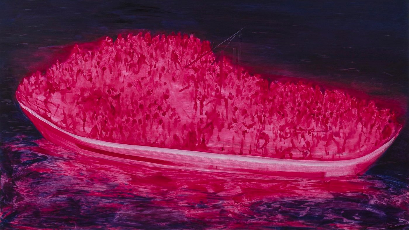 Zuerst ist da ein Leuchten. Pinkfarben und wie unter Scheinwerferlicht gleitet ein Boot durch die Schwärze der Nacht. Es ist überfüllt mit Figuren, die man nur schemenhaft erkennt, die dunkle Ölfarbe auf dem Bild umgibt es mit tiefdunklem Blau und Schwarz.