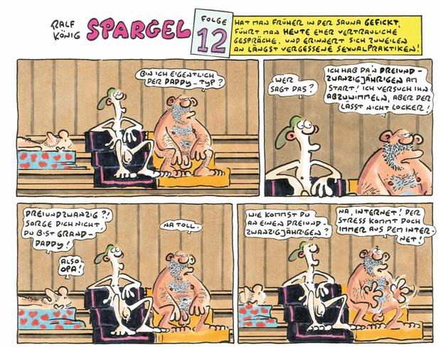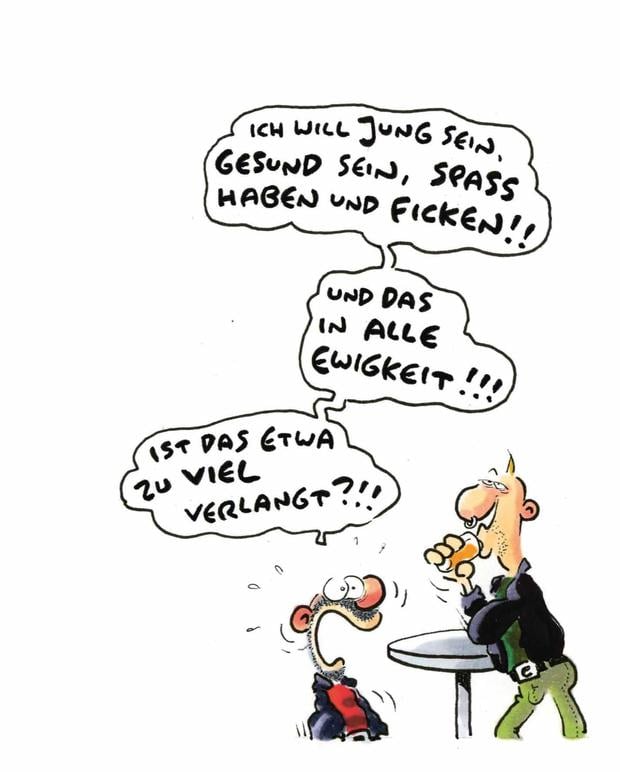 Seit einigen Jahren beschäftigt das Thema zunehmend auch seine beiden Langzeit-Hauptfiguren, das knollennasige Männer-Paar Konrad und Paul. Klavierlehrer und introvertierter Geistesmensch der eine, testosterongetrieben und auch im fortgeschrittenen Alter noch sexuell abenteuerlustig der andere. Die sind mit ihrem Schöpfer gealtert und eine Art Spiegelbild seines eigenen Lebens, wie er sagt.