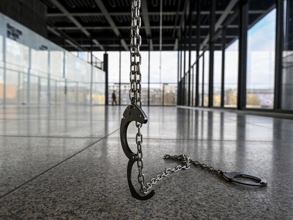 Ironie der Geschichte: Genau darum kreist Monica Bonvicinis Kunst. Wer gewinnt Macht über wen? Ketten, Handschellen, Ledergürtel, Bondage-Utensilien sind ihre Requisiten. In der Nationalgalerie hängen zwanzig Paar Handschellen entlang dreier Fensterfronten an langen Metallketten von der Decke. Auf Wunsch dürfen sich jeweils zwei Besucher für mindestens dreißig Minuten anschließen lassen, jeder an einem Ende der Kette, was als Einladung zur Kommunikation, zur Interaktion mit dem Gebäude gilt – „You to me“, so der Titel.