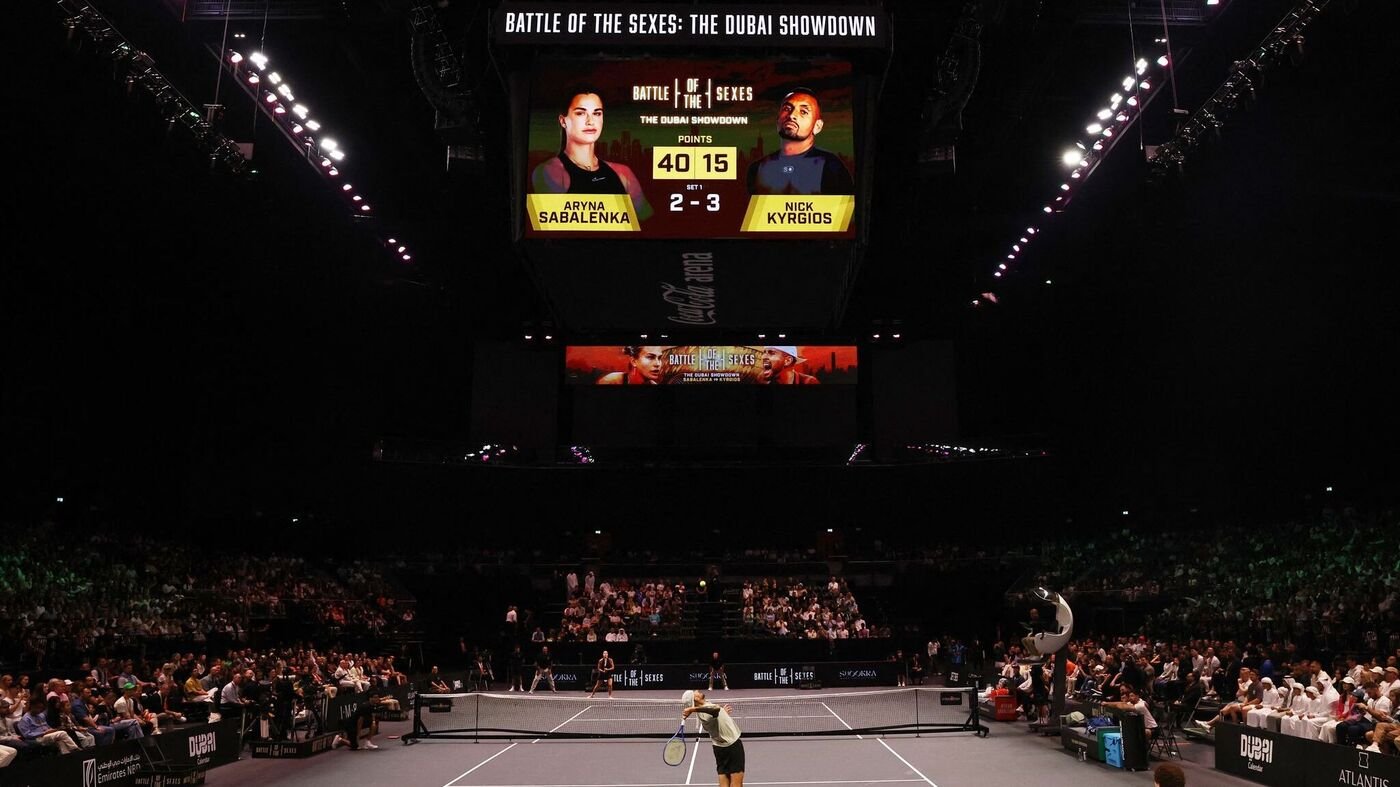 Der Australier Nick Kyrgios hat das mit Spannung erwartete Battle of the Sexes im Tennis gegen die Weltranglistenerste Aryna Sabalenka gewonnen. Der 30-Jährige setzte sich in einem wenig spektakulären Show-Event in Dubai mit 6:3, 6:3 gegen die drei Jahre jüngere Belarussin durch.