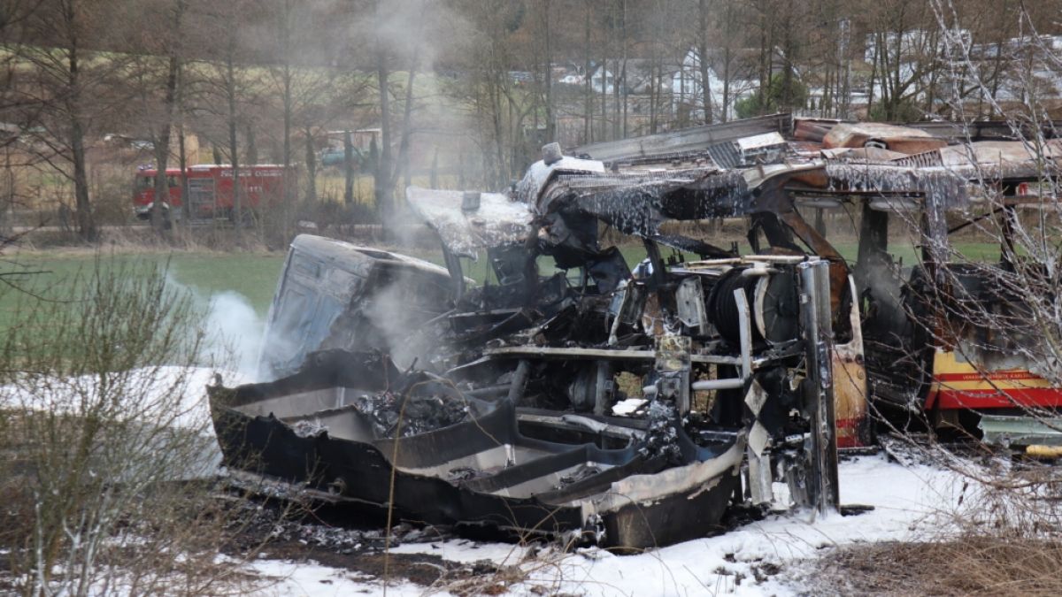 Sowohl der Tanklastwagen als auch die Stadtbahn brannten aus. Sie waren am Dienstagnachmittag auf der Landesstraße 552 in Ubstadt-Weiher zusammengestoßen und hatten Feuer gefangen.