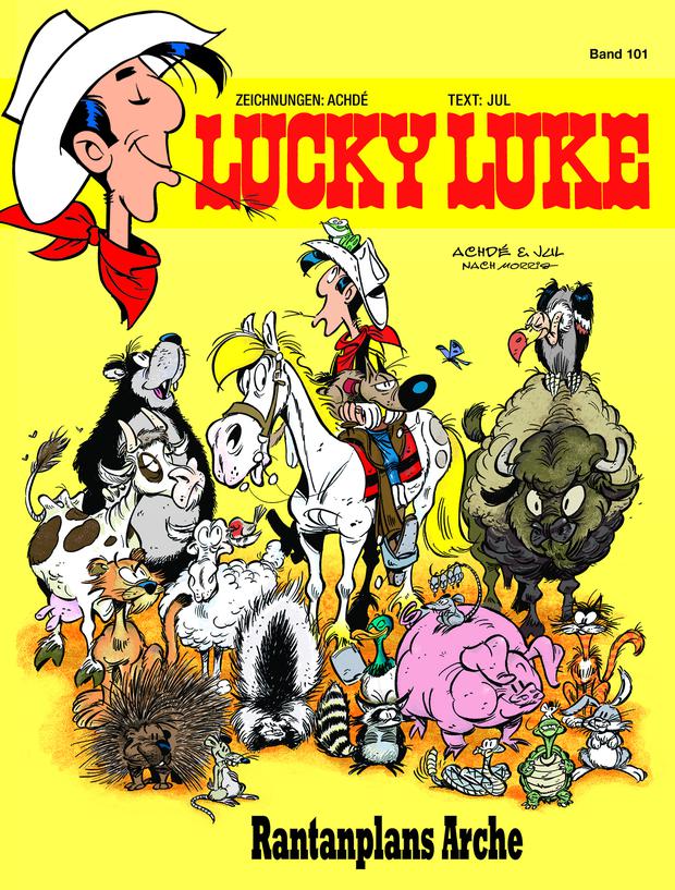 Als Tierfreund im Wilden Westen hat man es nicht leicht. Als Ovide Byrd – überzeugter Vegetarier und einziges Mitglied des Tierschutzvereins im Cowboy-Kaff Cattle Gulch – ein Pferd vor seinen menschlichen Peinigern rettet, entkommt er nur knapp dem Lynchmord. Das ist der Ausgangspunkt des 101. Lucky-Luke-Albums „Rantanplans Arche“, das in dieser Woche erscheint.