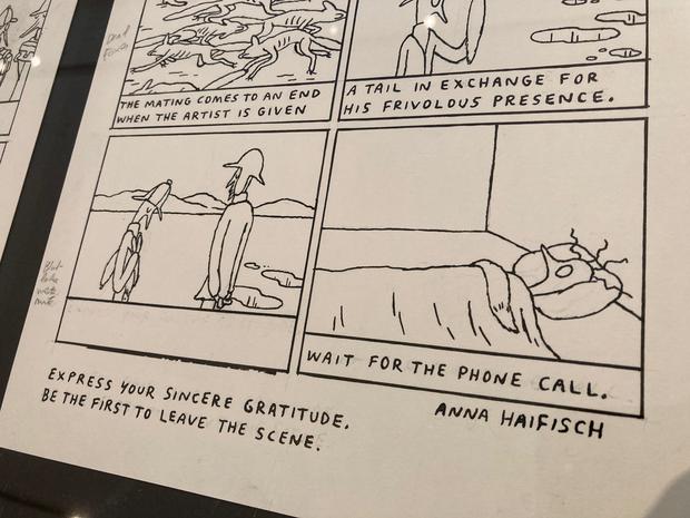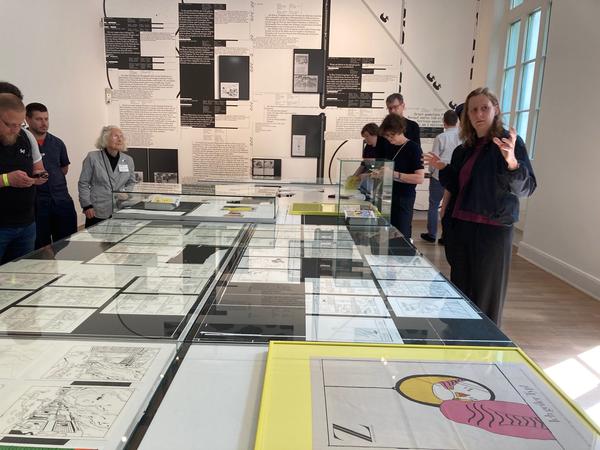 Dutzende mit fragilem, kratzigem Strich ausgeführte Skizzen und Tuschezeichungen liegen auf Arbeitstischen in der Mitte des ersten Museumssaals unter Glas, man sieht mit Bleistift ergänzte Korrekturhinweise und Anmerkungen („Blutlache weiter unten“). So kann man chronologisch den Schaffensprozess der Künstlerin der vergangenen zehn Jahre nachverfolgen. Dieser umfasst neben freien Arbeiten regelmäßig auch Auftragswerke für renommierte Medien wie „Die Zeit“, „Der Spiegel“ oder „The New Yorker“. Auf einem dieser Arbeitstische findet sich auch eine Zeichnung für den Tagesspiegel, die Anna Haifisch 2022 zum 100. Geburtstag ihres Idols Charles M. Schulz („Peanuts“) angefertigt hat.