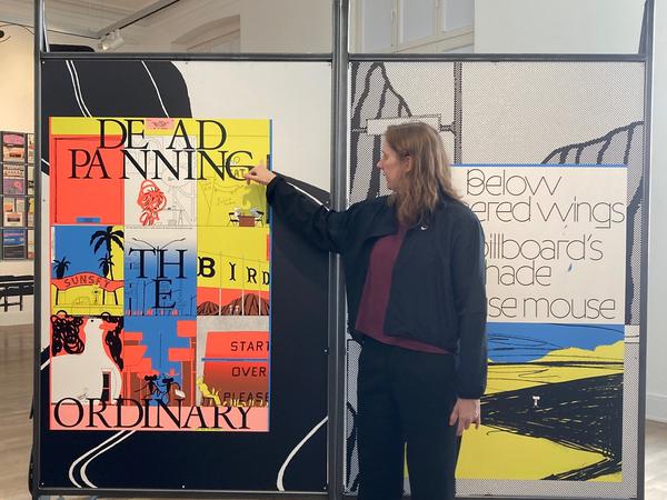 Ihr Beitrag „Deadpanning the Ordinary“ ist eine knallbunte sequenzielle Hommage an amerikanische Wegbereiter des Grafikdesigns und der postmodernen Architektur. Das zweite Bild ist ein illustriertes Haiku über eine kleine Maus im Schatten einer riesigen Werbetafel, das zentrale Motive aus Haifischs Werk aufgreift. Das dritte Bild mit dem Titel „Lost“ ist eine Collage von Vogel-Charakteren aus Haifischs Universum im visuellen Dialog mit dem „Roadrunner“, einer Zeichentrickfigur aus dem Animationsklassiker „Looney Tunes“.